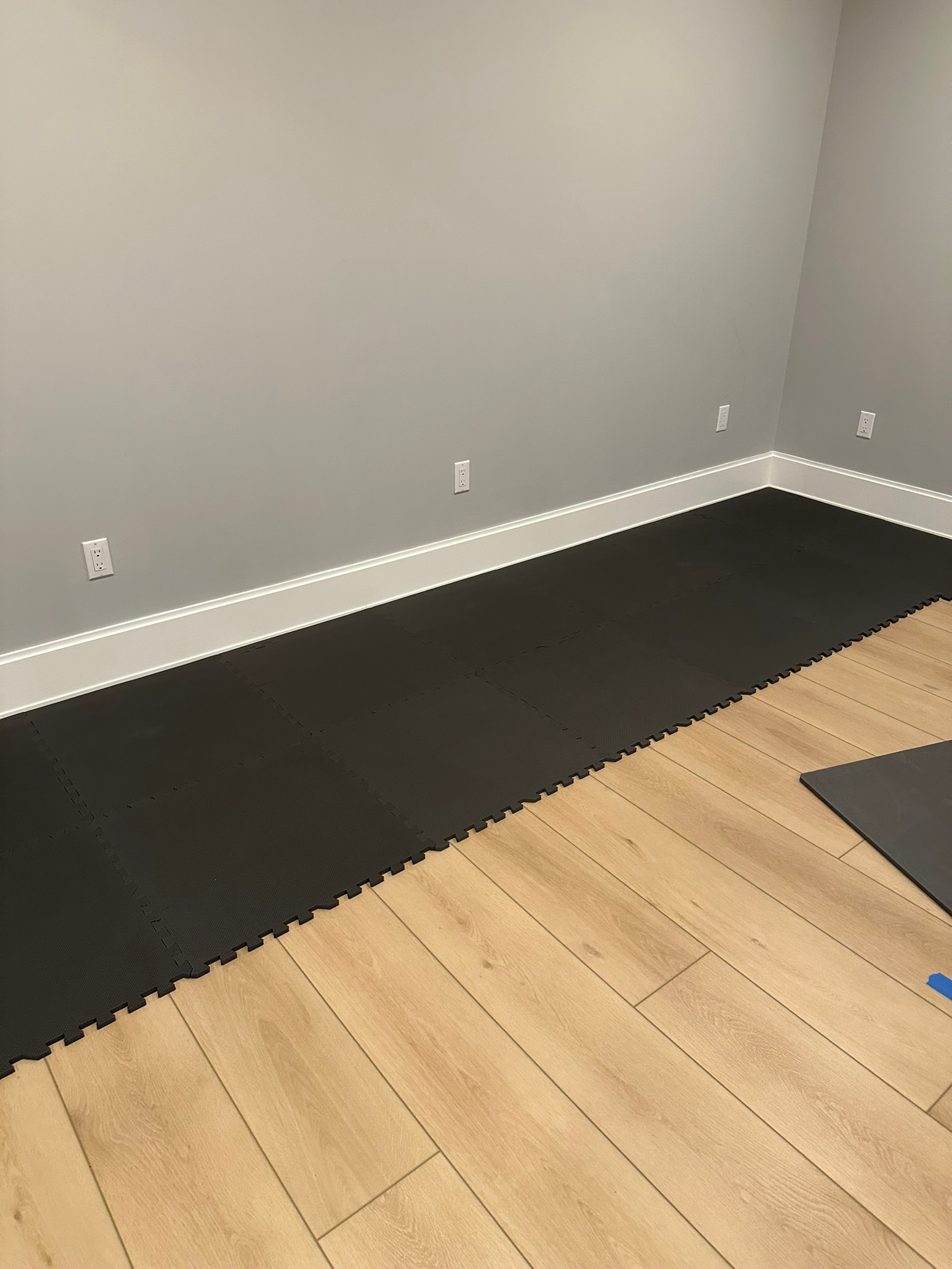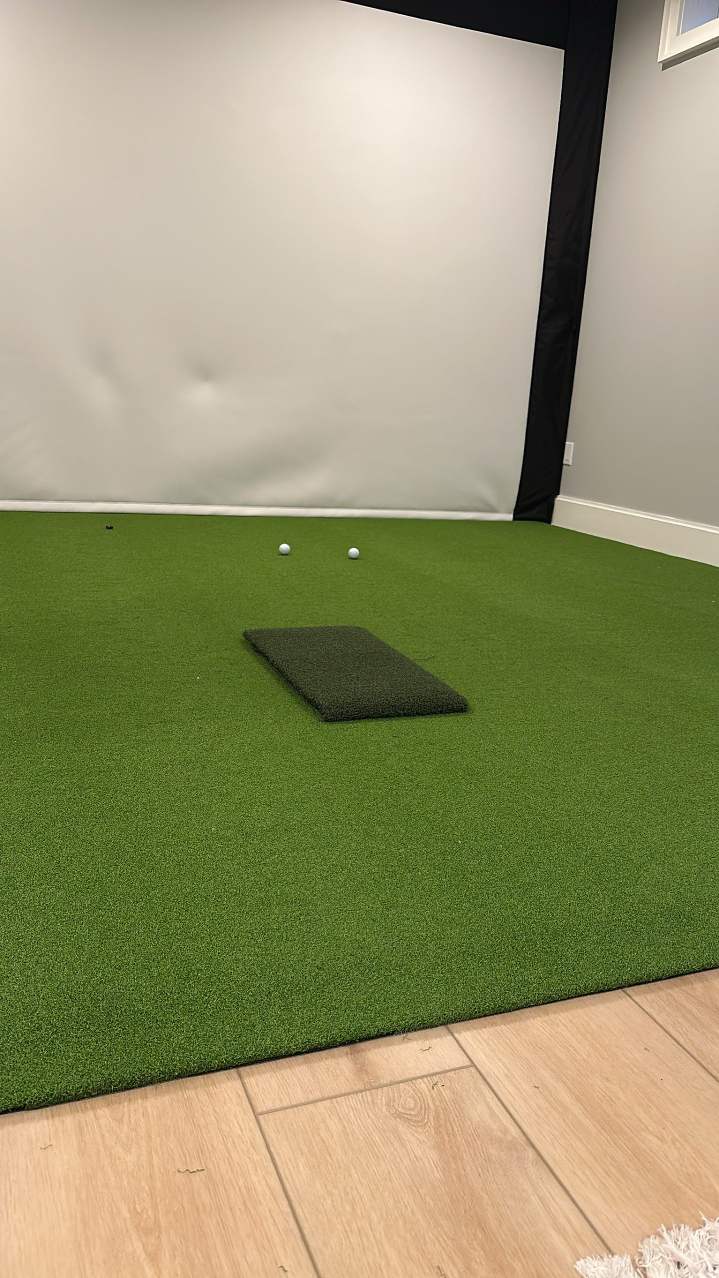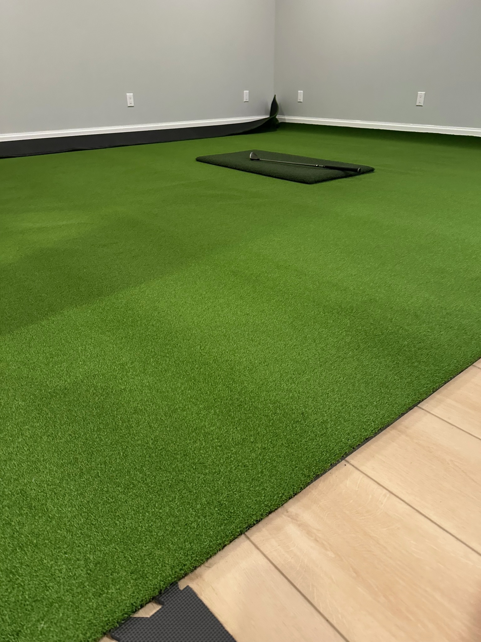 Flooring makes or breaks the look of a simulator room. I went with SynPro turf — a golf-specific artificial turf that looks great and performs well underfoot. It ships as a large roll that you cut to size.