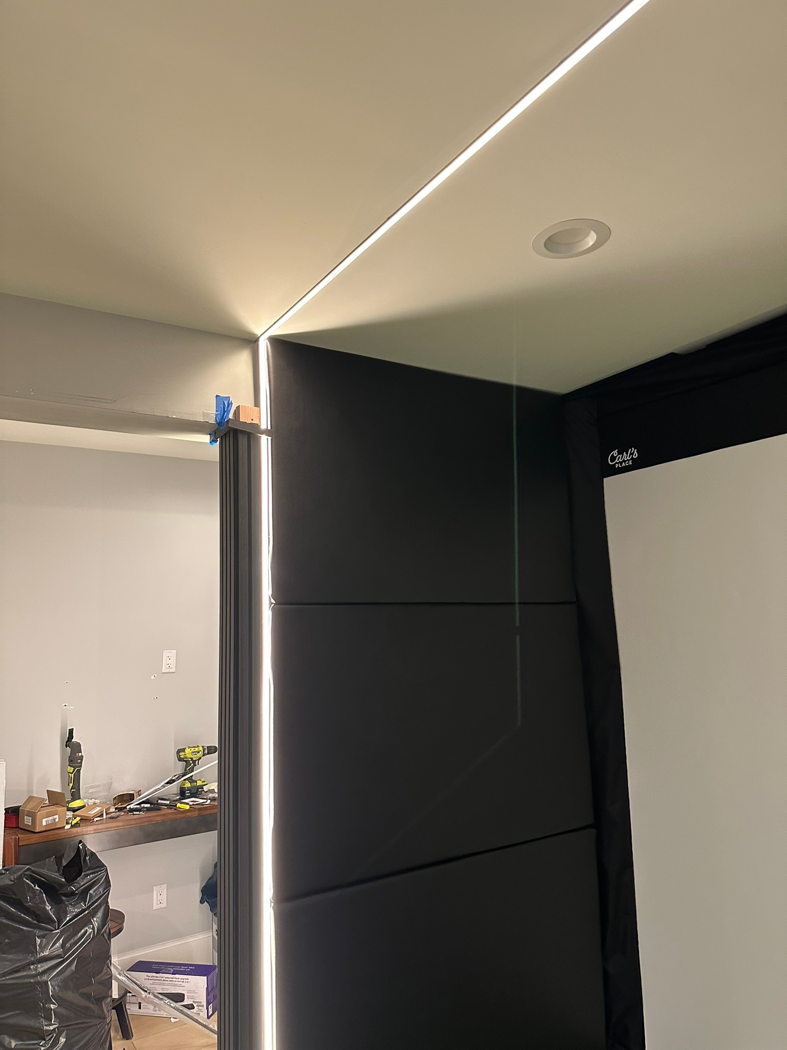 LED tip: Don’t run the LEDs directly behind the screen — you’ll get glare that washes out the projected image. Keep them on the side and rear walls only.