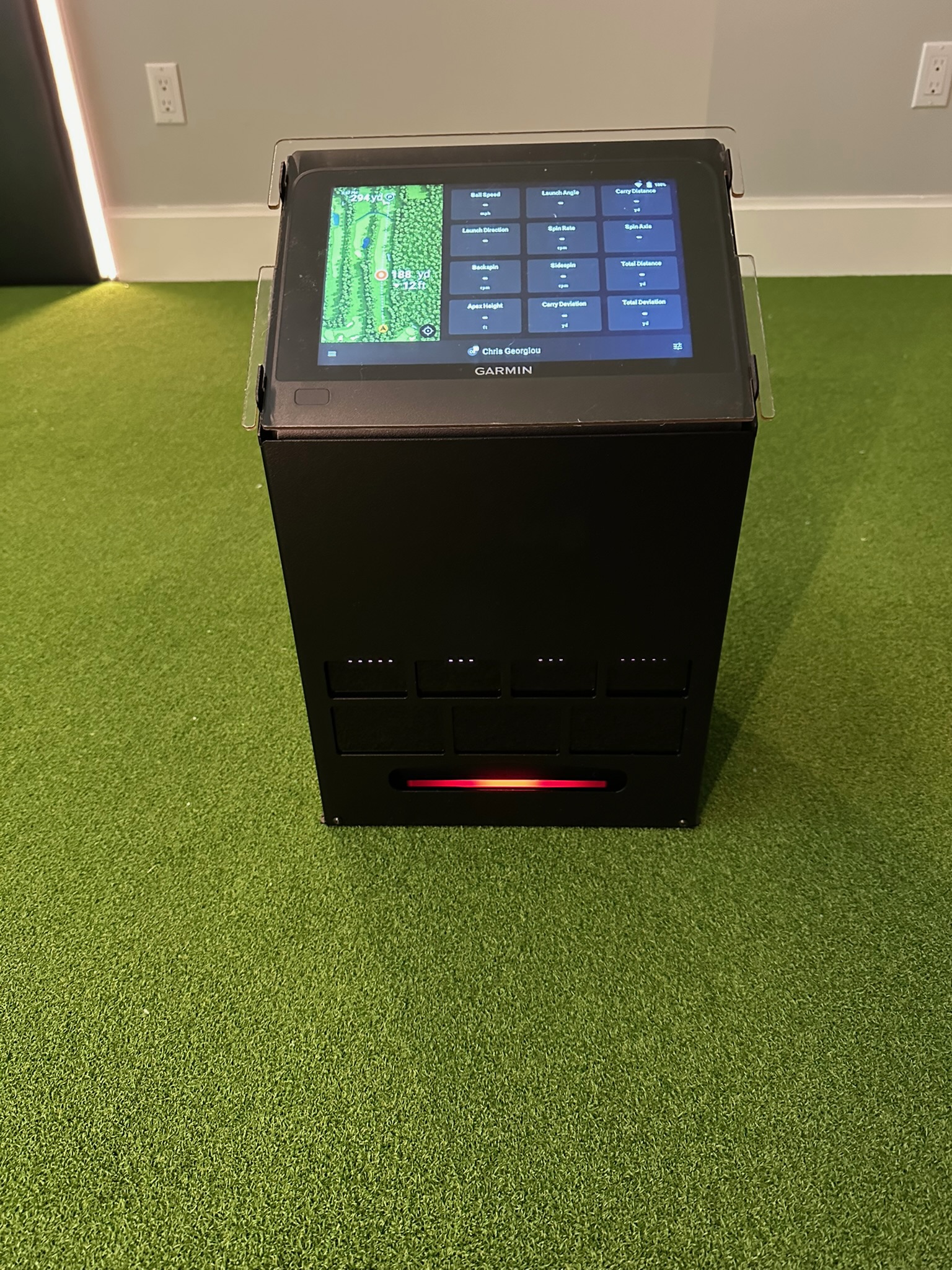 The launch monitor is the brain of the whole operation. I chose the Garmin Approach R50 after comparing it against the Mevo+ and Uneekor setups. The R50 won for Garmin’s accuracy reputation, the built-in touchscreen display, and E6 Connect software integration.